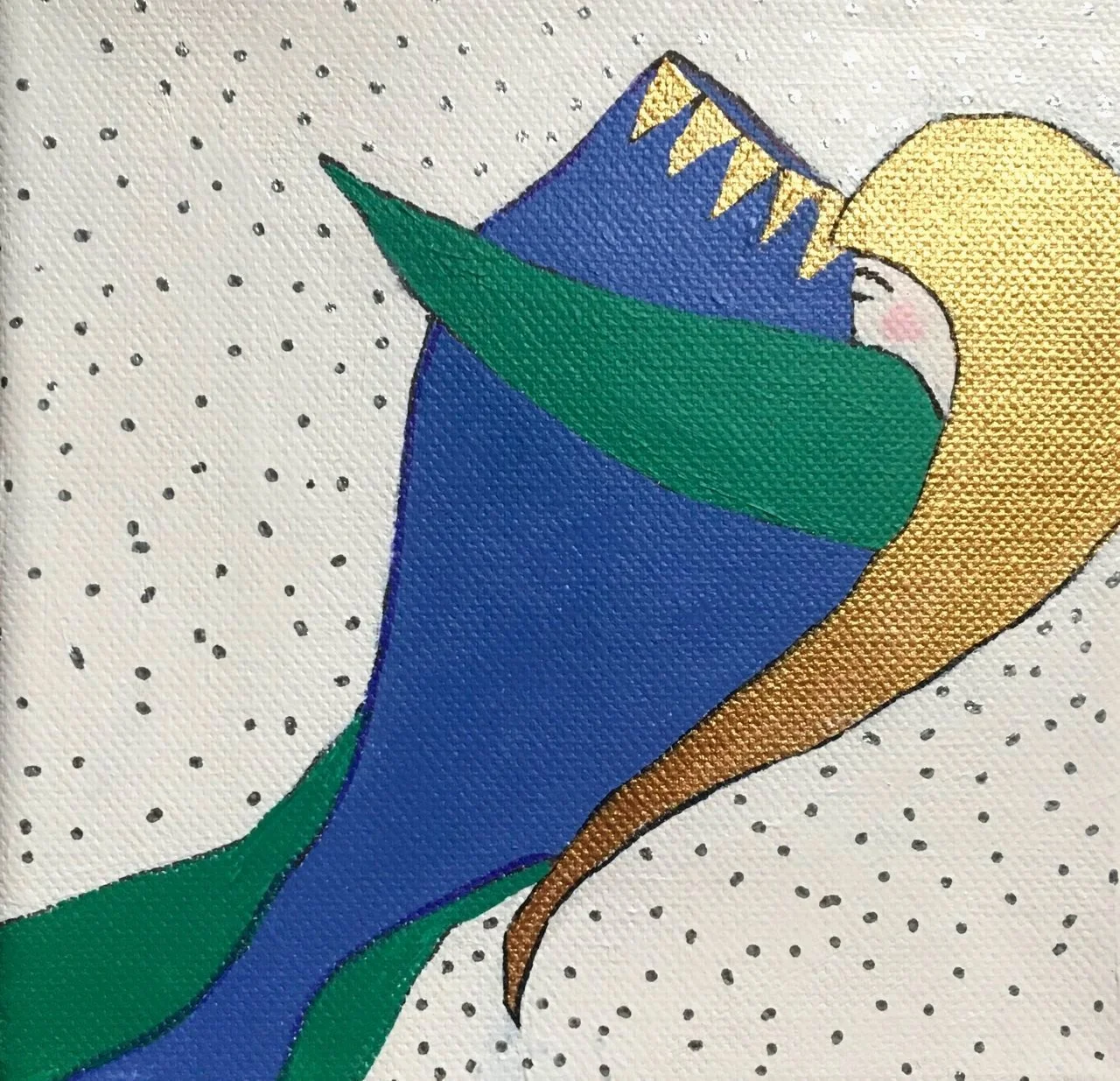 6” x 6” Acrylic on Canvas. “My heart is Gold. My Soul is old. My Spirit soars over mountains and trees and forests in shades of indigo and green. Hold my hand, as I lead you over the stream. You are my friend, my little dream.”